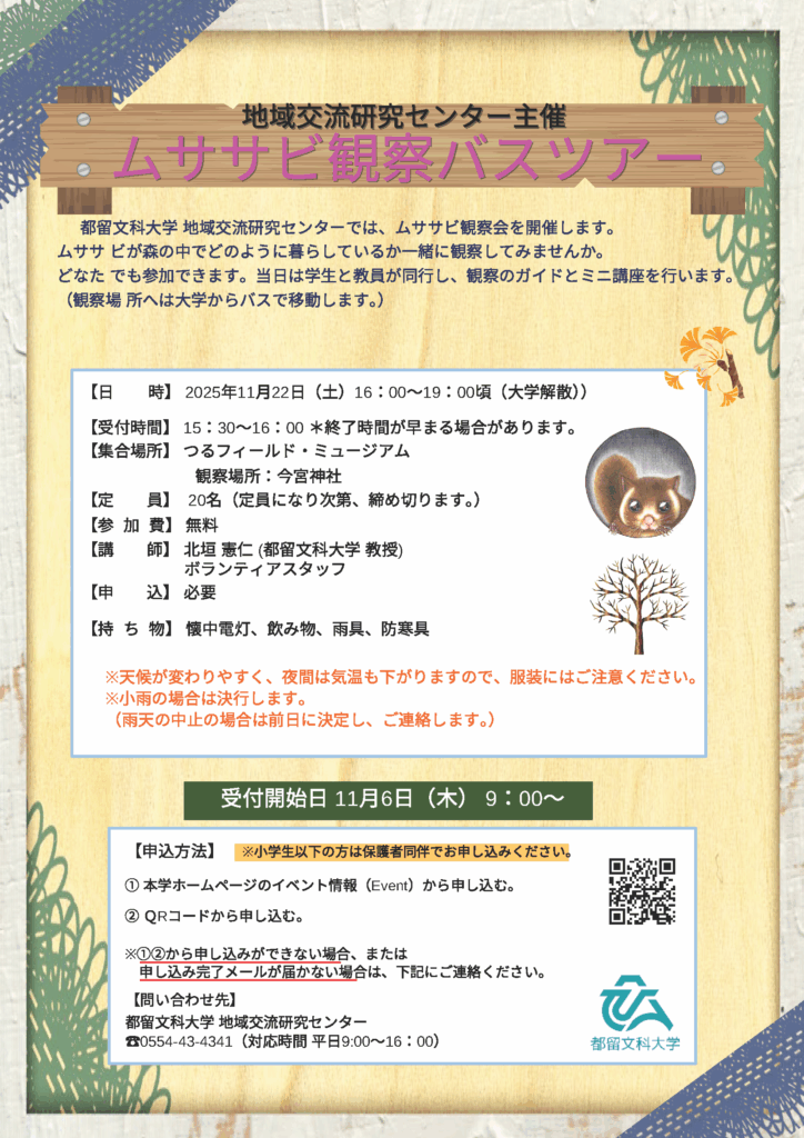 NEWS毎年、大好評の「ムササビ観察バスツアー」を開催します。ムササビが森の中でどのように暮らしているか一緒に観察してみませんか。