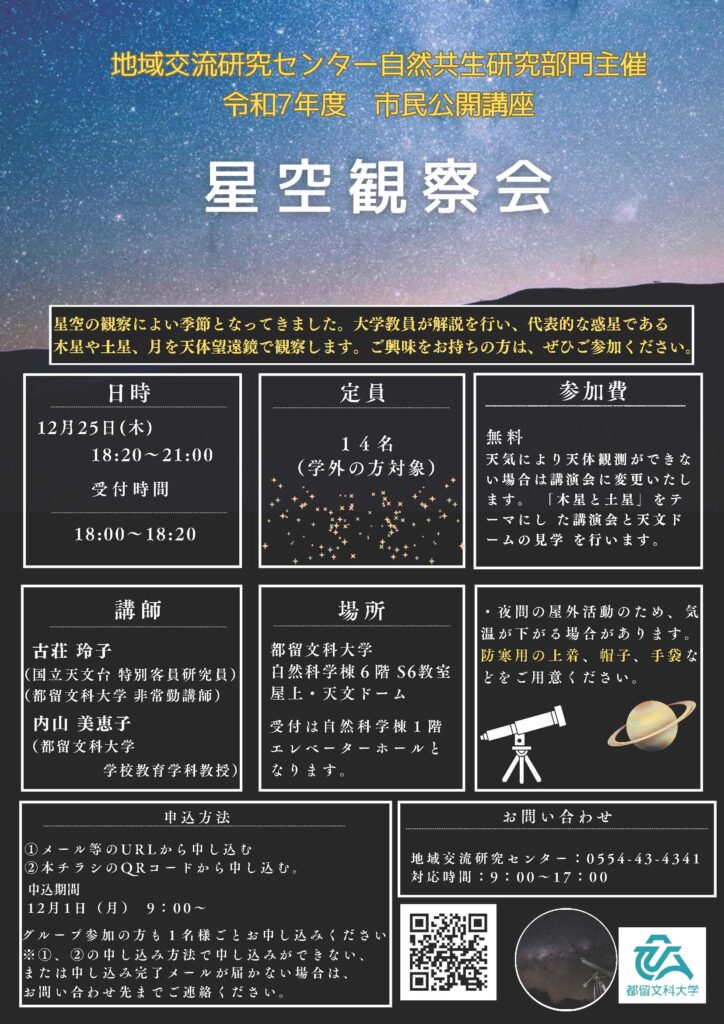 - 都留文科大学の学生は1月24日に開催する「学生を対象とした星空観察会」のお申し込みください!