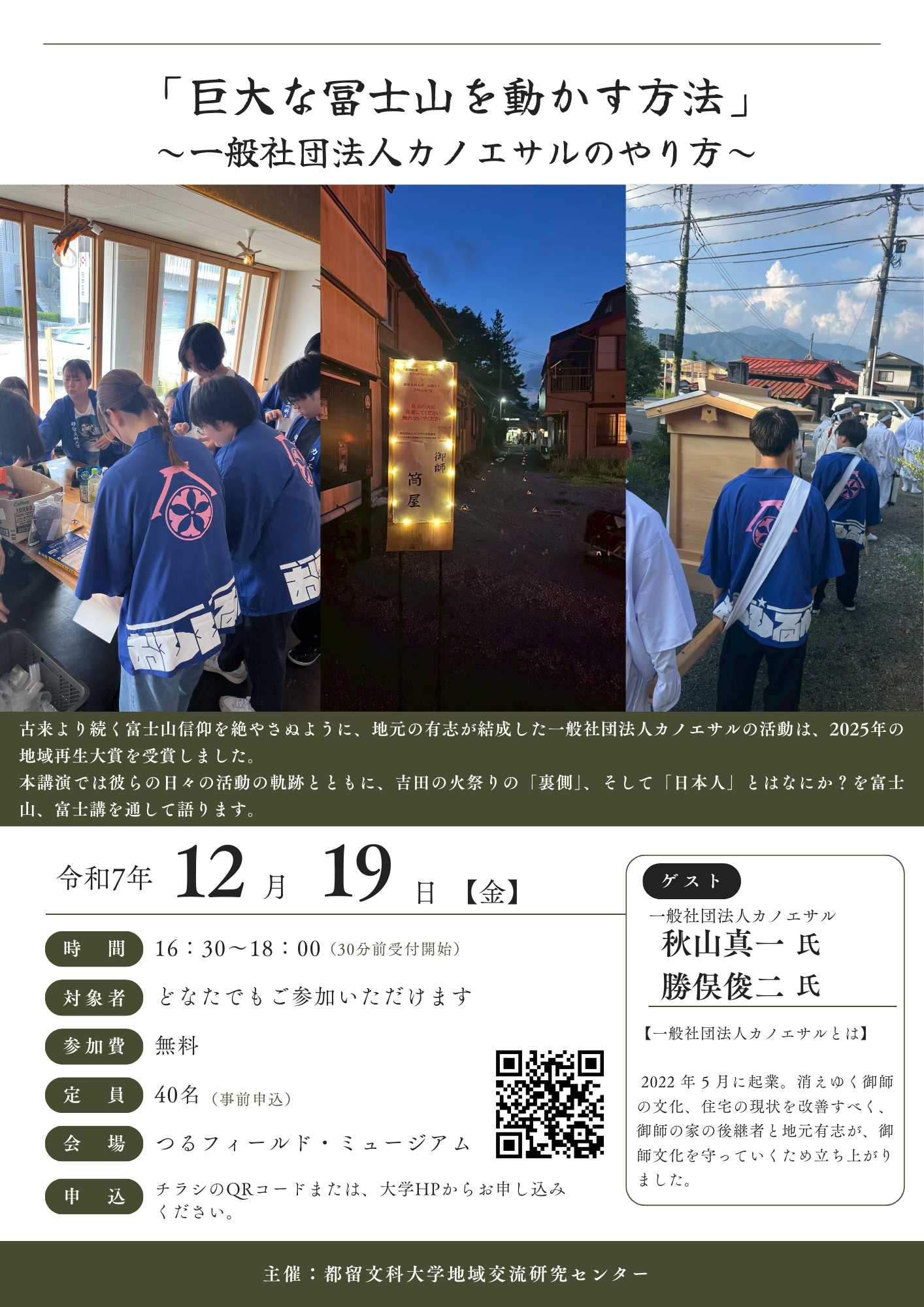 本講演では彼らの日々の活動の軌跡とともに、吉田の火祭りの「裏側」、そして「日本人」とはなにか?を富士山、富士講を通して語ります。