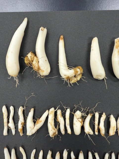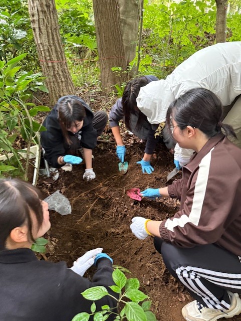 まず、森林ビオトープの土の中からカタクリの球根を掘り出す作業を行いました。学生たちはスコップを手に慎重に土を掘り進め、白く細長い球根を見つけるたびに歓声が上がりました。
