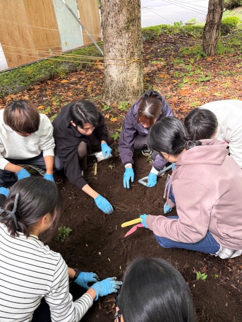 次に、学内入口近くの「トチノキ広場」に移植を行いました。大きな球根は深めに、小さな球根は浅めに、丁寧に植え付けます。学生たちは「来春、花が咲くのが楽しみ!」と笑顔で話していました。