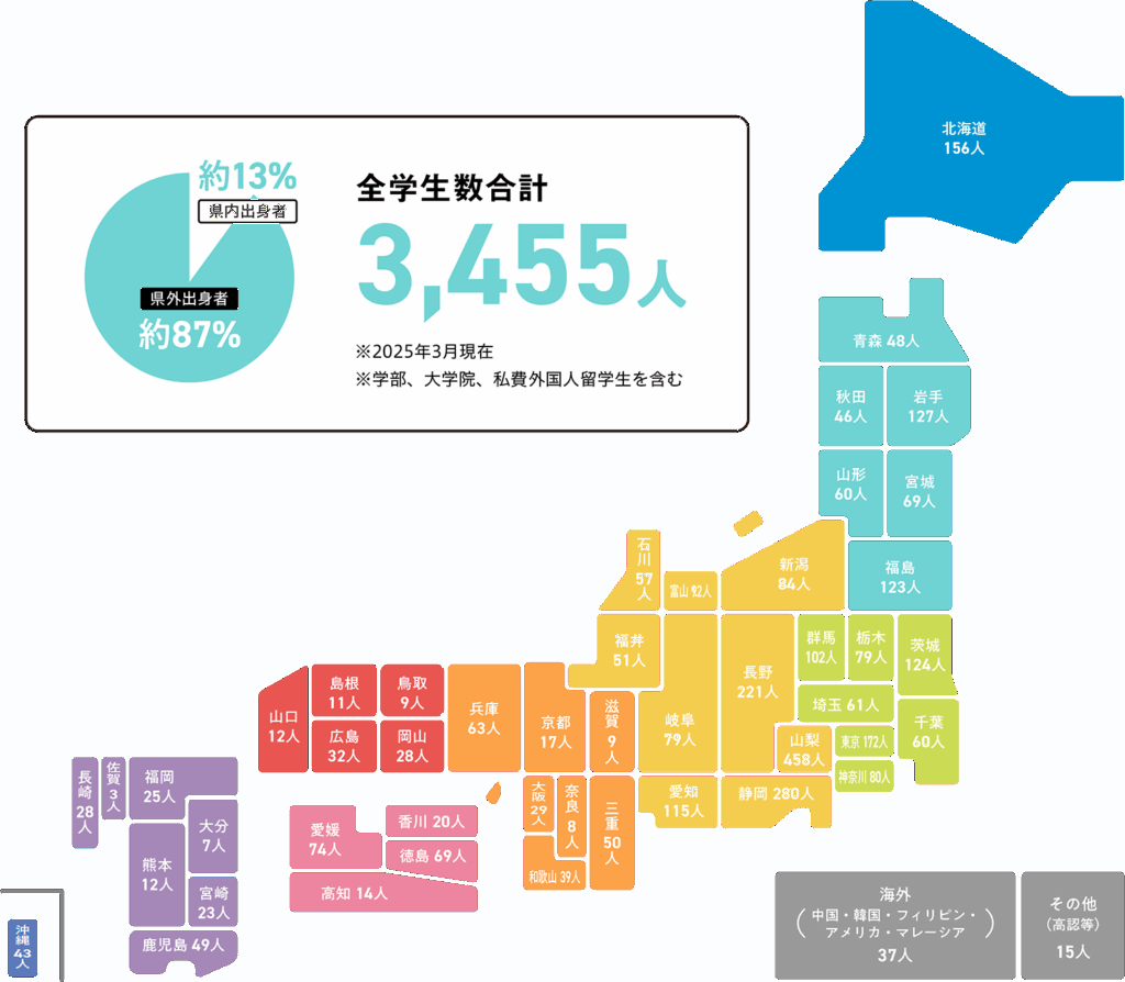 そのうち山梨県内出身者は約13%、残りの約87%は山梨県外出身者です。