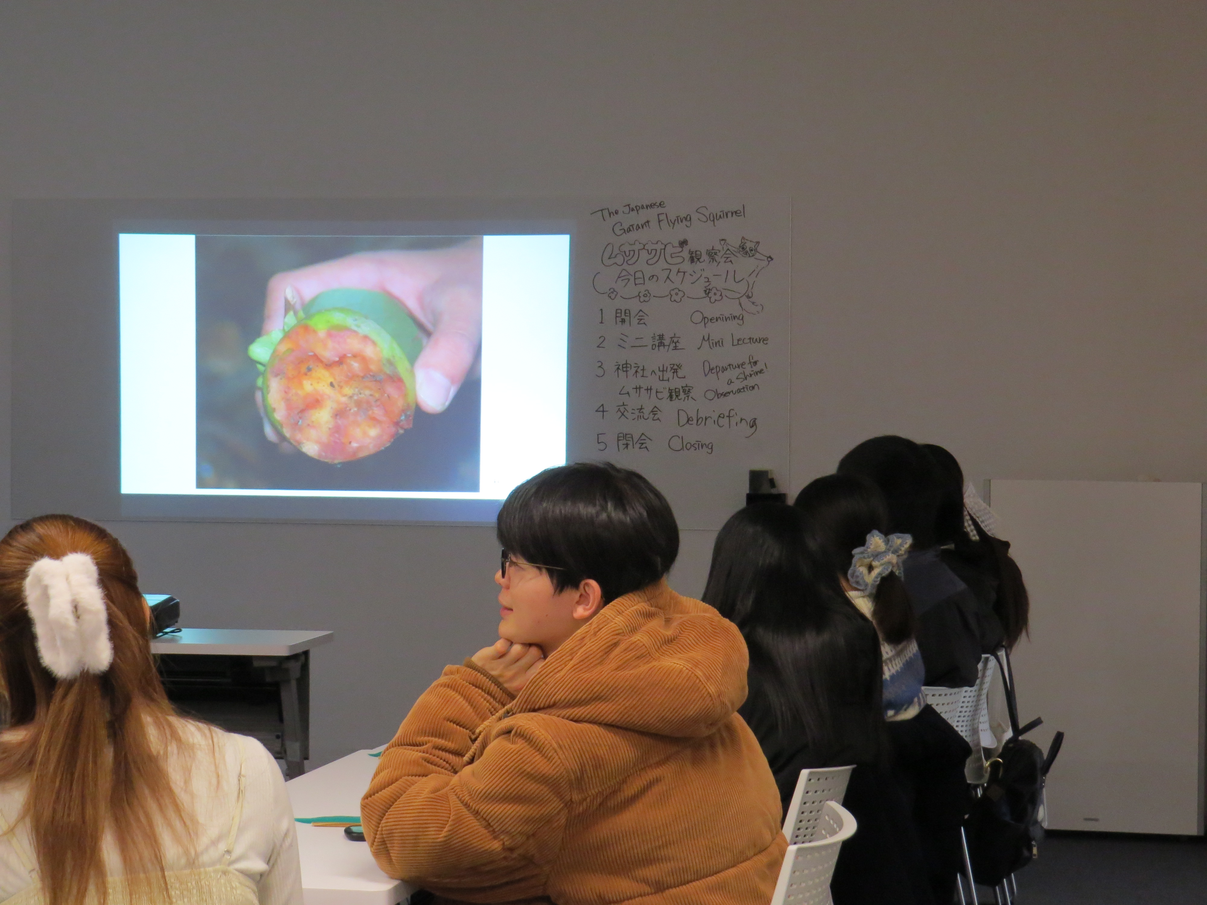 前半は、「つるフィールド・ミュージアム」にて、ムササビに関するミニ講座を実施し、後半は今宮神社へ行きムササビの観察を行いました。