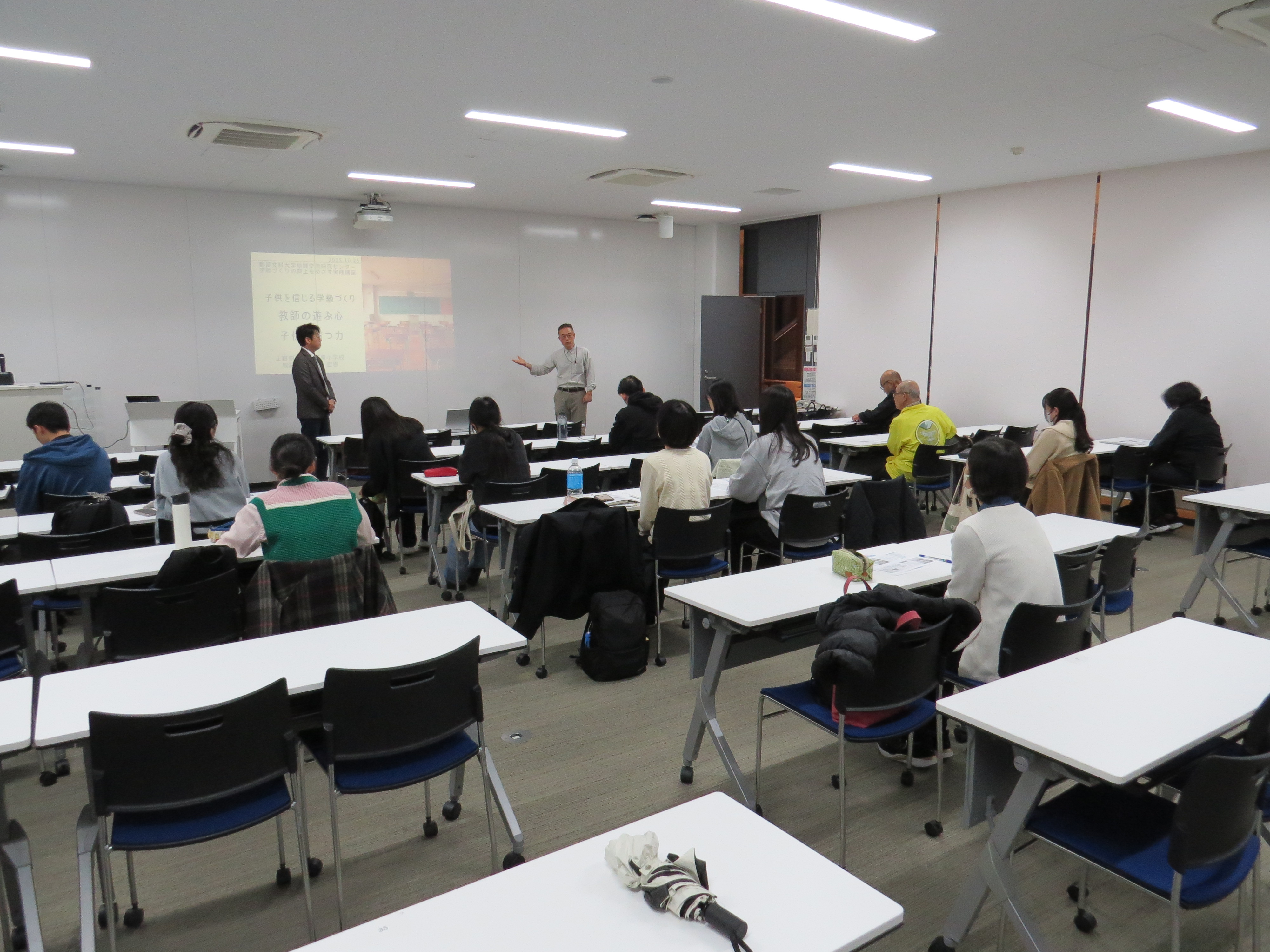 当日は、県内の小中高の教員、本学学生(1年生~4年生)など21名の参加があり、「学級づくりの分岐点~組織する力を子供と共に伸ばすには~​​​」をテーマに実施しました。