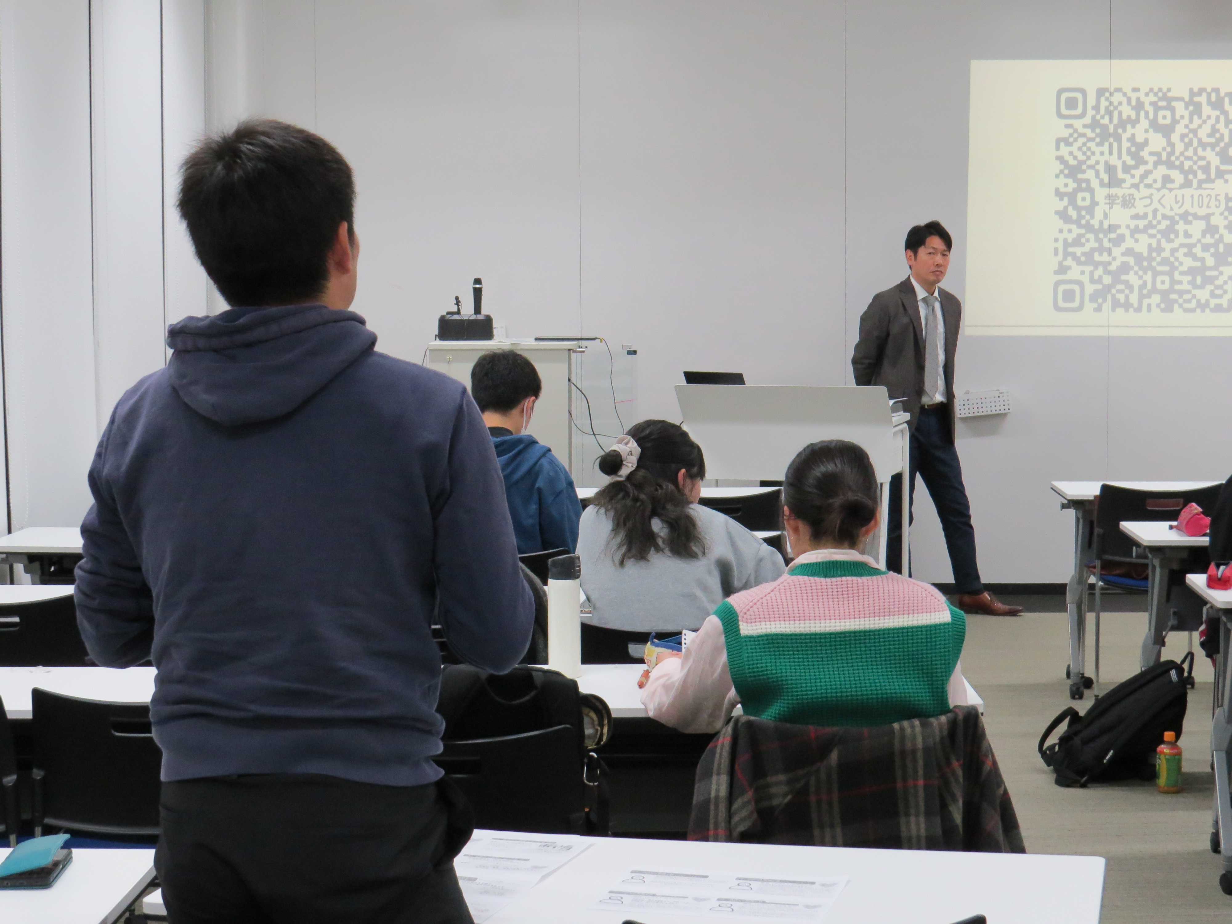 ​「たちまち直面する壁―学級担任1年目の悩みから」や、「秩序の崩壊に一人で立ち向かう怖さ」、「学級づくりの仲間を見出す―師、友、そして子どもたち」、「学校は組織的に子どもを守り、鍛え、育てる場所」、についてペアワークや情報交換をしながら考えました。