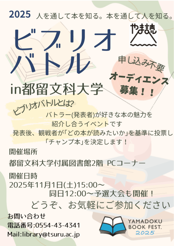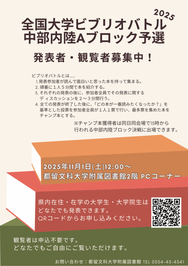 11月1日(土)全国大学ビブリオバトル2025中部内陸Aブロック地区予選を行います。バトラー(発表者)として参加ご希望のかたは申込フォームより、お申し込みをお願いいたします。