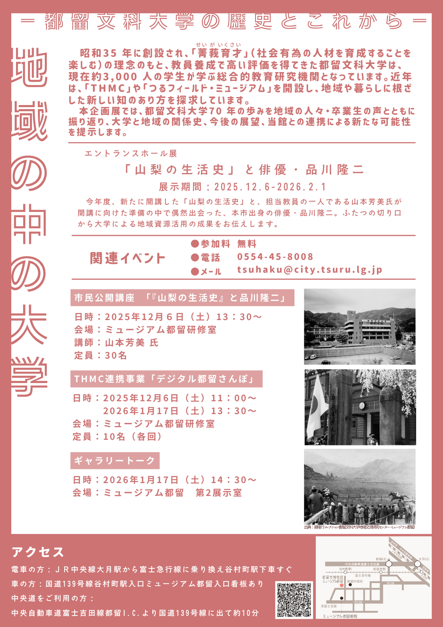 さらに、関連イベントとして、本学比較文化学科 山本芳美教授による市民公開講座「『山梨の生活史』と品川隆二」も開催されます。書籍制作にまつわる背景や当時の取材を通して、地域社会の姿や人々の営みについて理解を深めます。