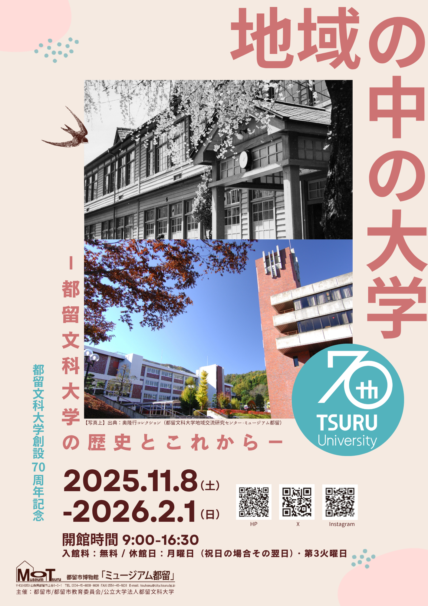 大学創設70周年を記念し、ミュージアム都留にて企画展「地域の中の大学 ―都留文科大学の歴史とこれから―」が開催されます。