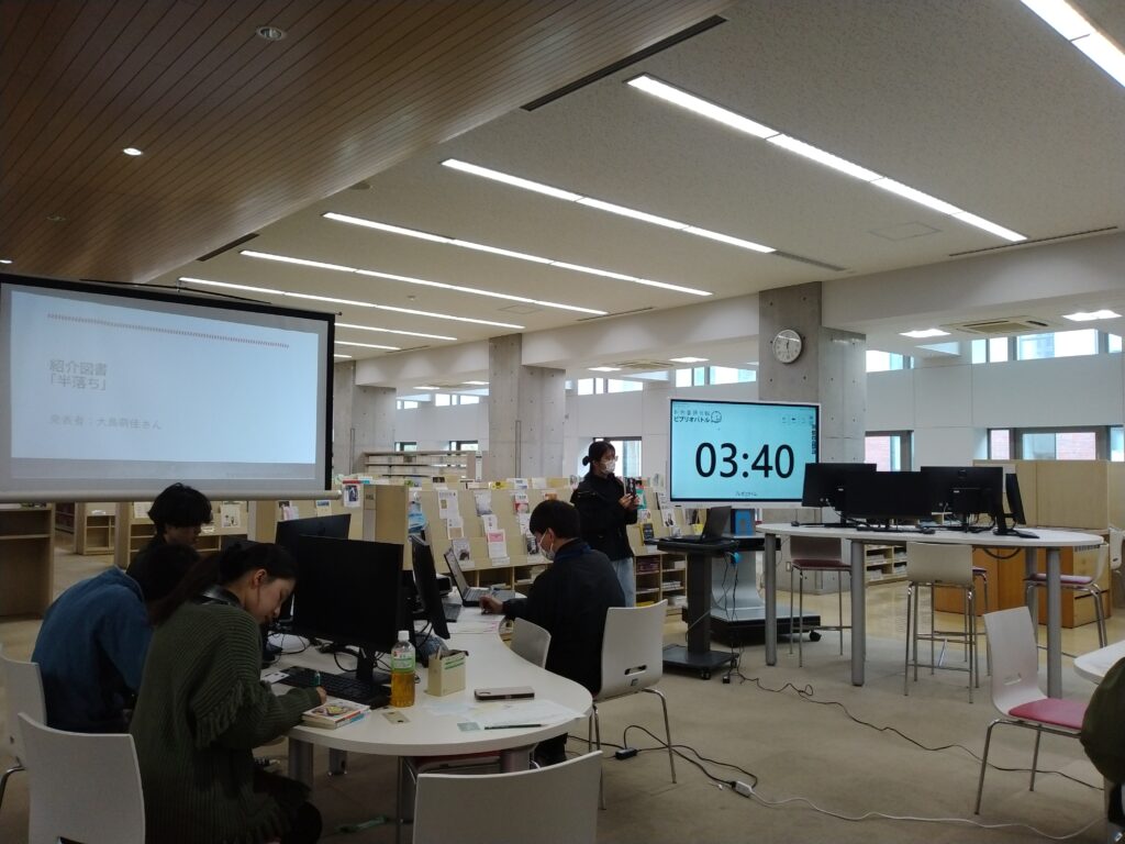 予選のチャンプ本は国文学科2年生の大島萌佳さんが紹介した「半落ち」となりました。