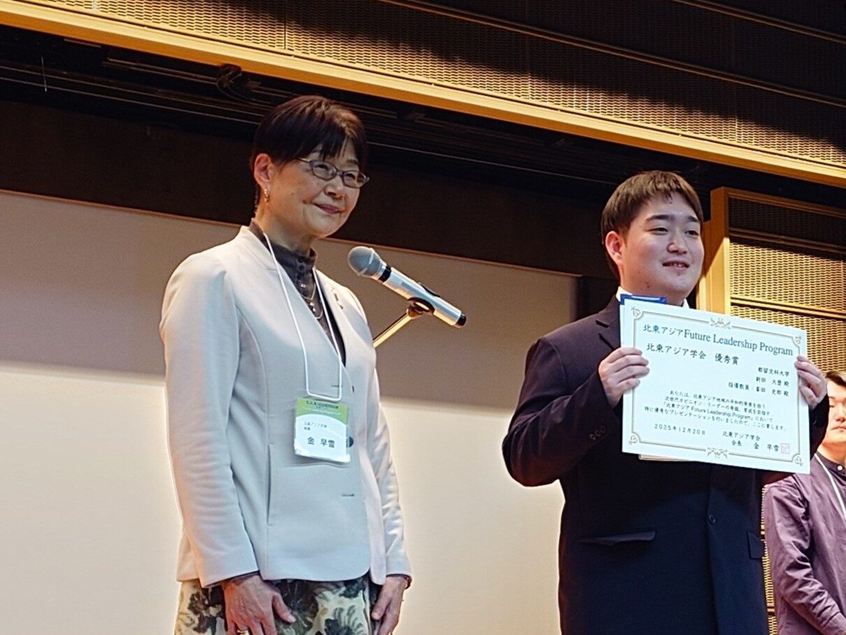 地域社会学科3年 新田 大登さん(国際政治学 峯田史郎准教授ゼミ)は、「地方から支える越境大気汚染対策―NEASPECとLTPを基盤に―」を発表し、北東アジア学会「優秀賞」を受賞しました。