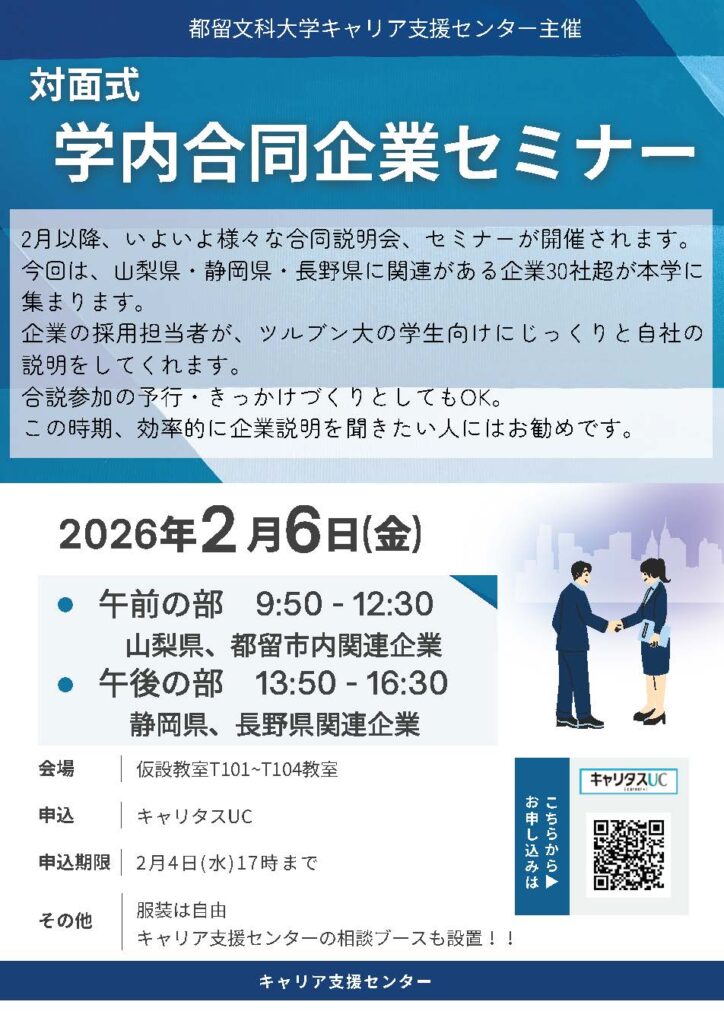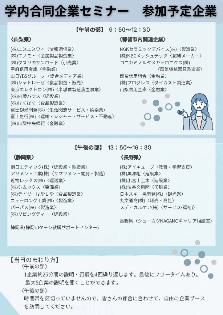 2月以降、いよいよ様々な合同企業説明会やセミナーが開催されます。今回は、山梨県・静岡県・長野県に関連する企業30社以上が本学に集結し、採用担当者が学生の皆さんに向けて、業界の特徴や企業の取り組み、仕事の魅力について詳しく説明します。企業や業界を知る絶好の機会です。初めての合同説明会参加に向けた予行練習や情報収集のきっかけづくりとしてもおすすめです。 効率的に複数企業の話を聞き、将来のキャリア選択に役立てましょう。