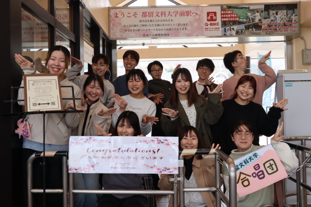 都留文科大学前駅にて都留文科大学合唱団が新入生を歓迎するミニコンサートを開催中!(3/30~4/3)